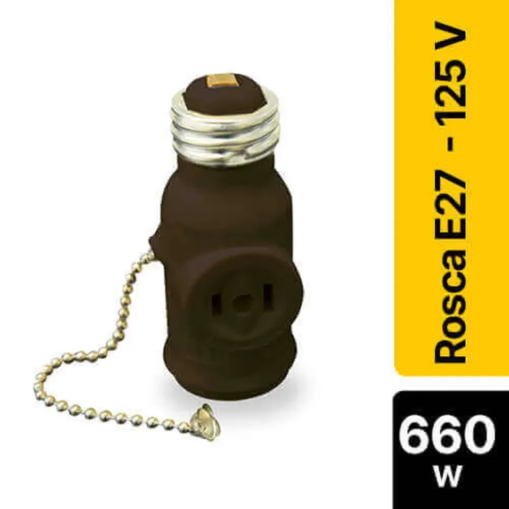 – Portalámparas benjamín con cadena baquelita boquilla para bombillo. – Material: baquelita – Cadenilla de encendido y apagado – Tipo de rosca: E27 – Corriente: 15A – Salidas: 2