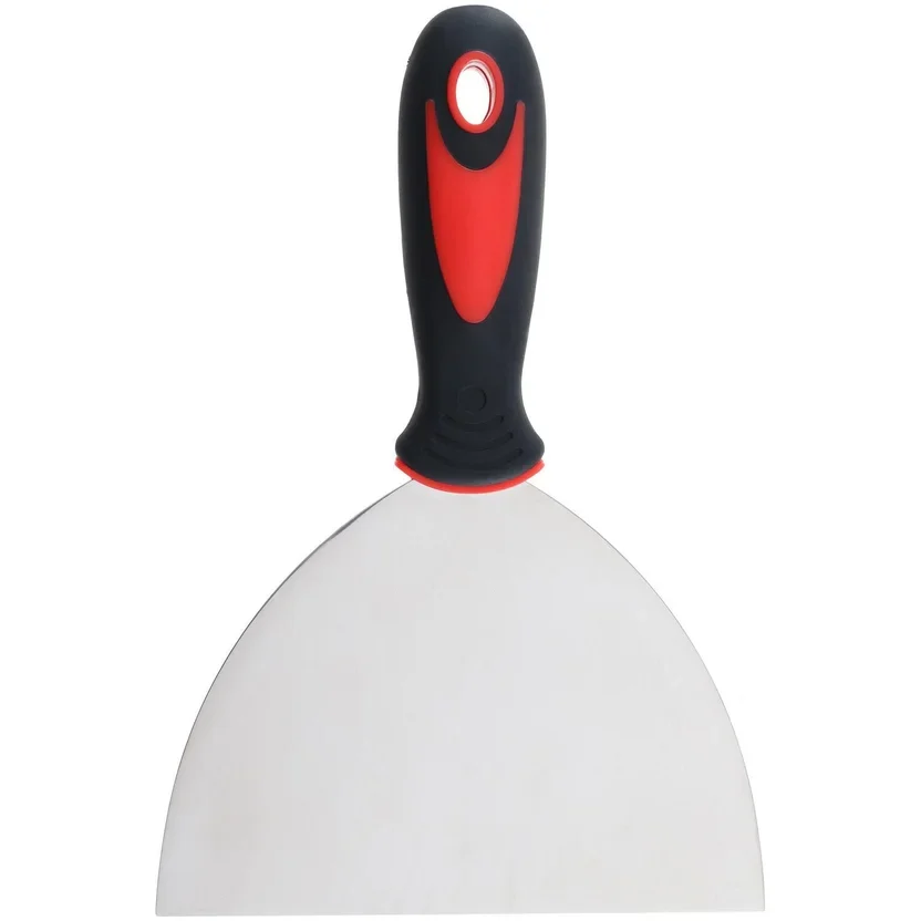 Espátula con mango plástico rojo y negro, diseño ergonómico para cómodo y fácil agarre, con una perforación que permite su práctico almacenamiento.