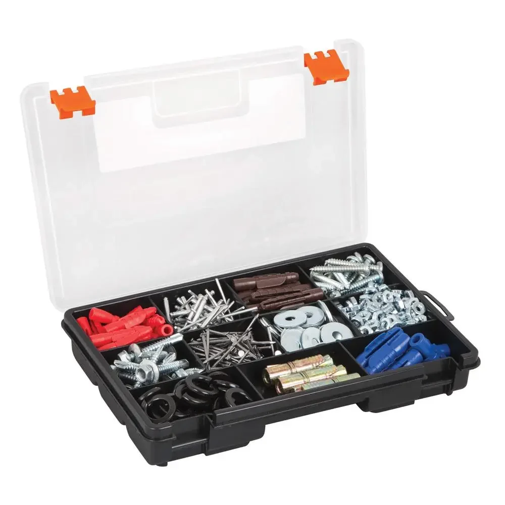 Fabricado en polipropileno Compartimentos para guardar accesorios pequeños Broches de uso rudo para evitar que el contenido se salga del interior Tapa transparente con broches